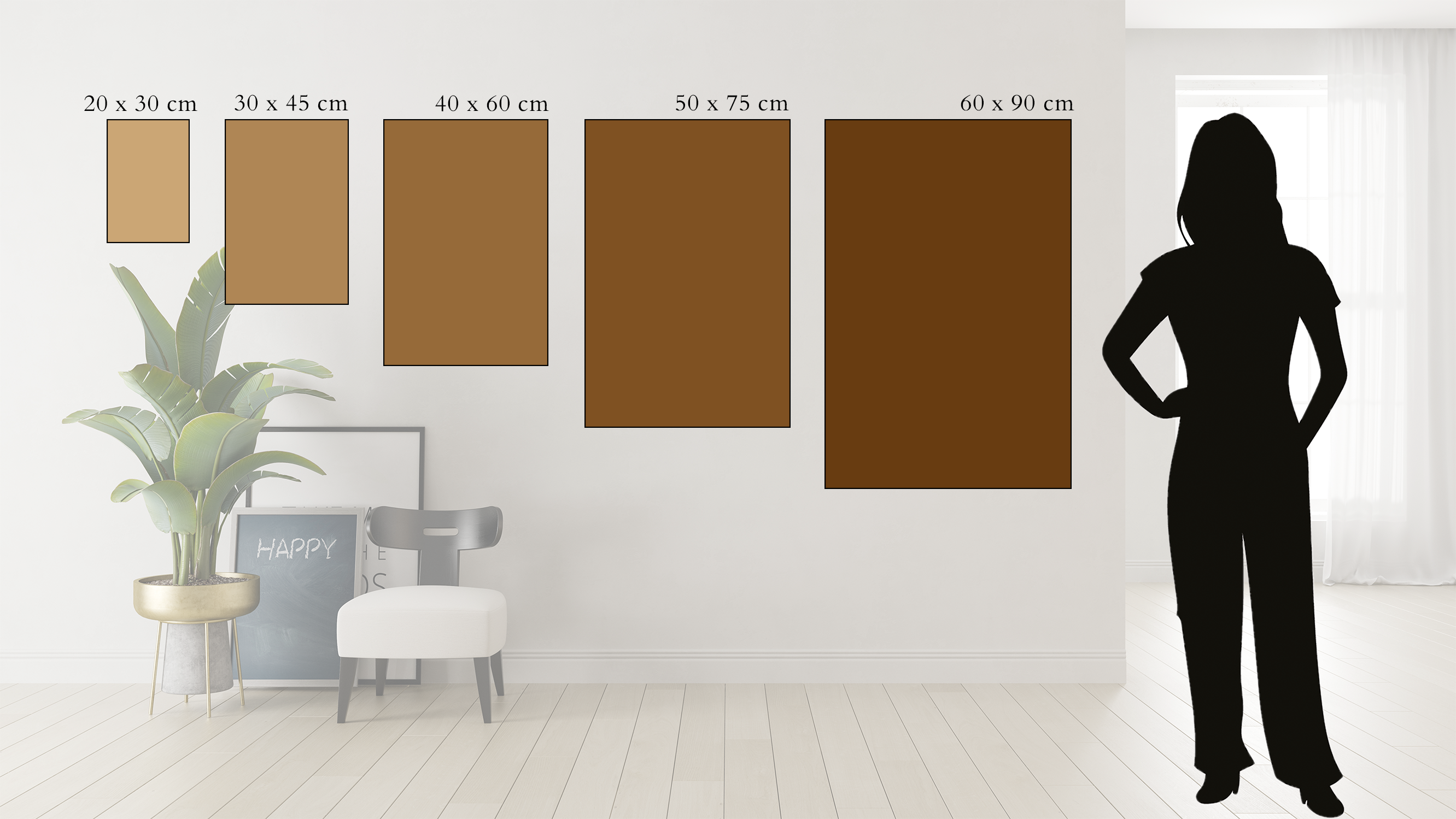 Onze kunstwerken zijn in verschillende afmetingen verkrijgbaar. Of je nu op zoek bent naar een echte blikvanger voor je woonkamer of een klein kunstwerk om je bureau op te fleuren, er is voor elke locatie of situatie wel iets passends te vinden.